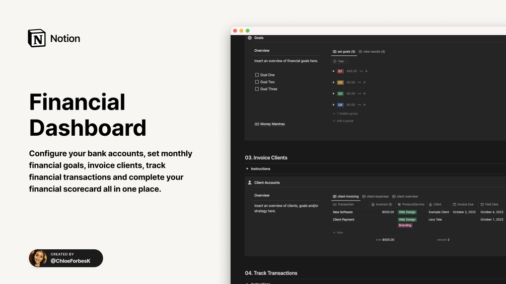 Financial Dashboard in Notion. Set your financial goals, manage client account, track transactions and review your financial performance.